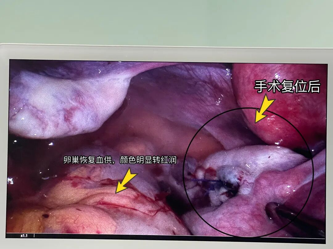急診科急請(qǐng)婦科會(huì)診,并完善了相關(guān)檢查,“CT提示有包塊,加上患者下腹部觸壓疼痛,伴有惡心嘔吐,有運(yùn)動(dòng)史,并且尿HCG為陰性,所以我當(dāng)時(shí)判斷應(yīng)該是卵巢囊腫蒂扭轉(zhuǎn)或者卵巢囊腫破裂?!敝蛋噌t(yī)生李芳說(shuō)。更讓人擔(dān)心的是,晶晶自發(fā)病到現(xiàn)在已經(jīng)超過(guò)24小時(shí),蒂扭轉(zhuǎn)如不及時(shí)進(jìn)行手術(shù),將會(huì)導(dǎo)致卵巢壞死,需要切除卵巢?!榜R上手術(shù)!”在婦科副主任劉曉紅的一聲令下,晶晶被送入手術(shù)室進(jìn)行腹腔鏡手術(shù)。術(shù)中,劉曉紅副主任及李芳醫(yī)生發(fā)現(xiàn)晶晶右側(cè)部分卵巢及部分輸卵管形成蒂部扭轉(zhuǎn)720°,蒂粗約1cm,表面呈紫蘭色,兩位醫(yī)生立即進(jìn)行手術(shù)復(fù)位,并對(duì)囊腫進(jìn)行剝除,約20分鐘后,卵巢恢復(fù)血供,顏色明顯轉(zhuǎn)紅潤(rùn)。