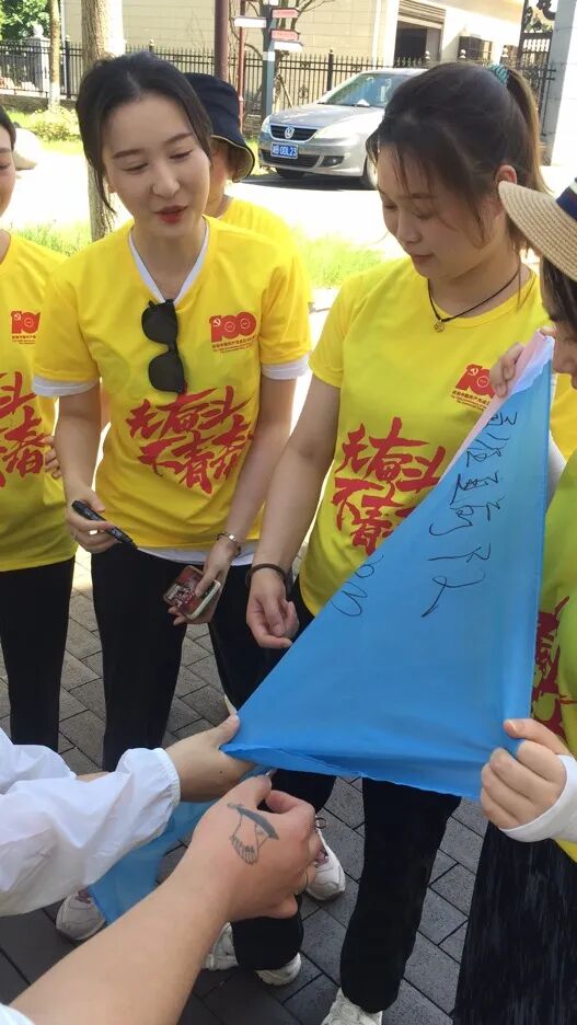 下午兩點,二醫(yī)團(tuán)員青年準(zhǔn)時趕到李立三故居陳列館外邊的廣場上開展團(tuán)建活動。在進(jìn)行了2個簡單的破冰游戲之后,二醫(yī)團(tuán)員青年們被分為4個小組,每一組都為自己戰(zhàn)隊取了一個響亮的名字,確定了自己戰(zhàn)隊的口號和隊歌,在隊旗上簽上了所有隊員名字,并上臺依次介紹和展示。