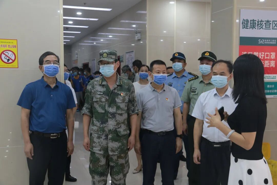 ▲株洲軍分區(qū)司令員張臺華大校、石峰區(qū)區(qū)長劉政凱到株洲市二醫(yī)院健康管理中心視察征兵體檢工作