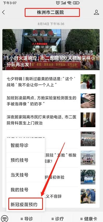 ■ 打開微信,搜索株洲市二醫(yī)院,或掃描下方二維碼,進(jìn)入株洲市二醫(yī)院微信服務(wù)號(hào)選擇“新冠疫苗預(yù)約”
