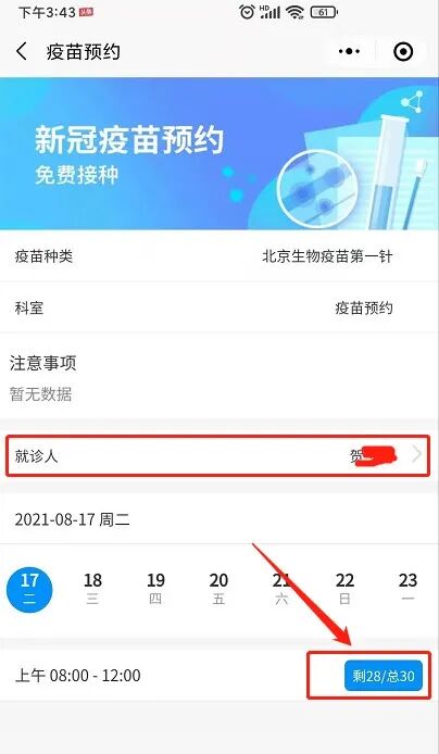 ■ 選擇好就診人、指定日期時(shí)間段 點(diǎn)擊號(hào)源數(shù)量 預(yù)約疫苗