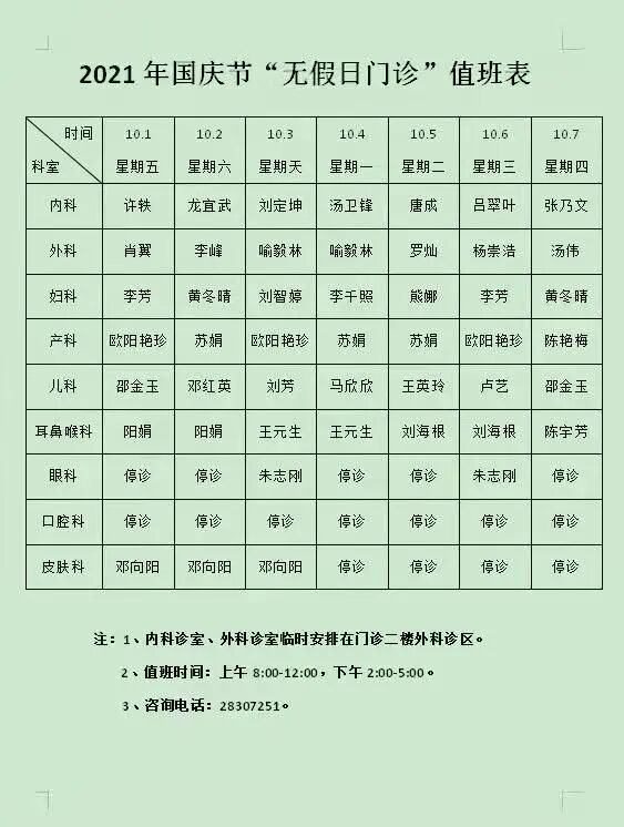 2021年國(guó)慶節(jié)假期(10月1日至10月7日,共7天),株洲市二醫(yī)院門診工作安排如下: