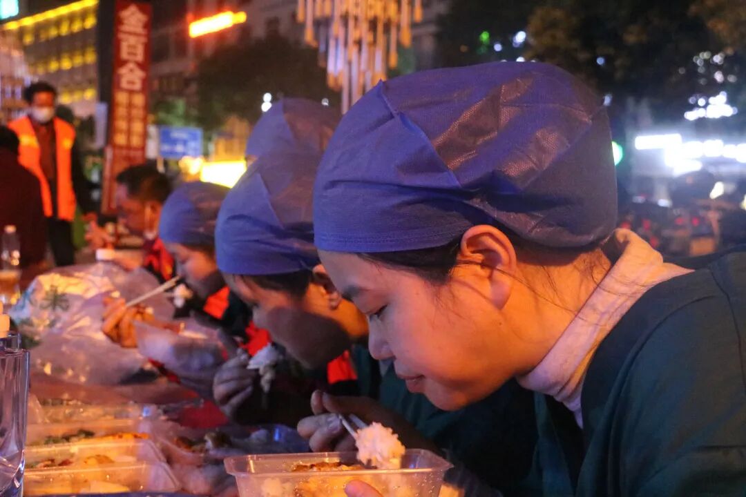 ▲市二醫(yī)院核酸采集突擊隊(duì)成員蹲在路邊趕緊吃完飯,開(kāi)始接班核酸采樣工作