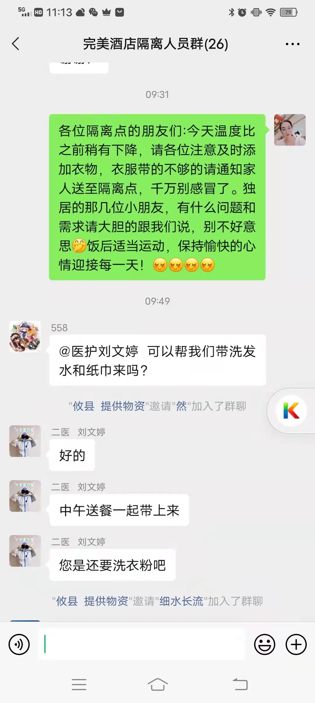 10月29日早上6點就接到新增酒店2位姑娘的求助電話,兩位小姑娘非?;?,想換人,立馬趕往酒店給他們做心理建設(shè),梳理工作流程,并查看酒店改造結(jié)果,盯著她們接待8個隔離人員,安排妥當(dāng)后離開。