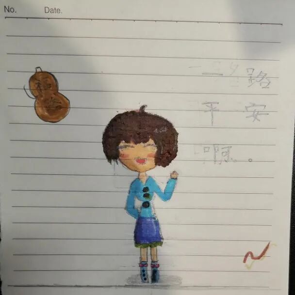 “出發(fā)的前一天,我女兒神神秘秘的走到我身邊輕輕的吻了我的臉頰,然后把這幅畫放在我手里對我說:媽媽你一定要平平安安的回來,加油!”