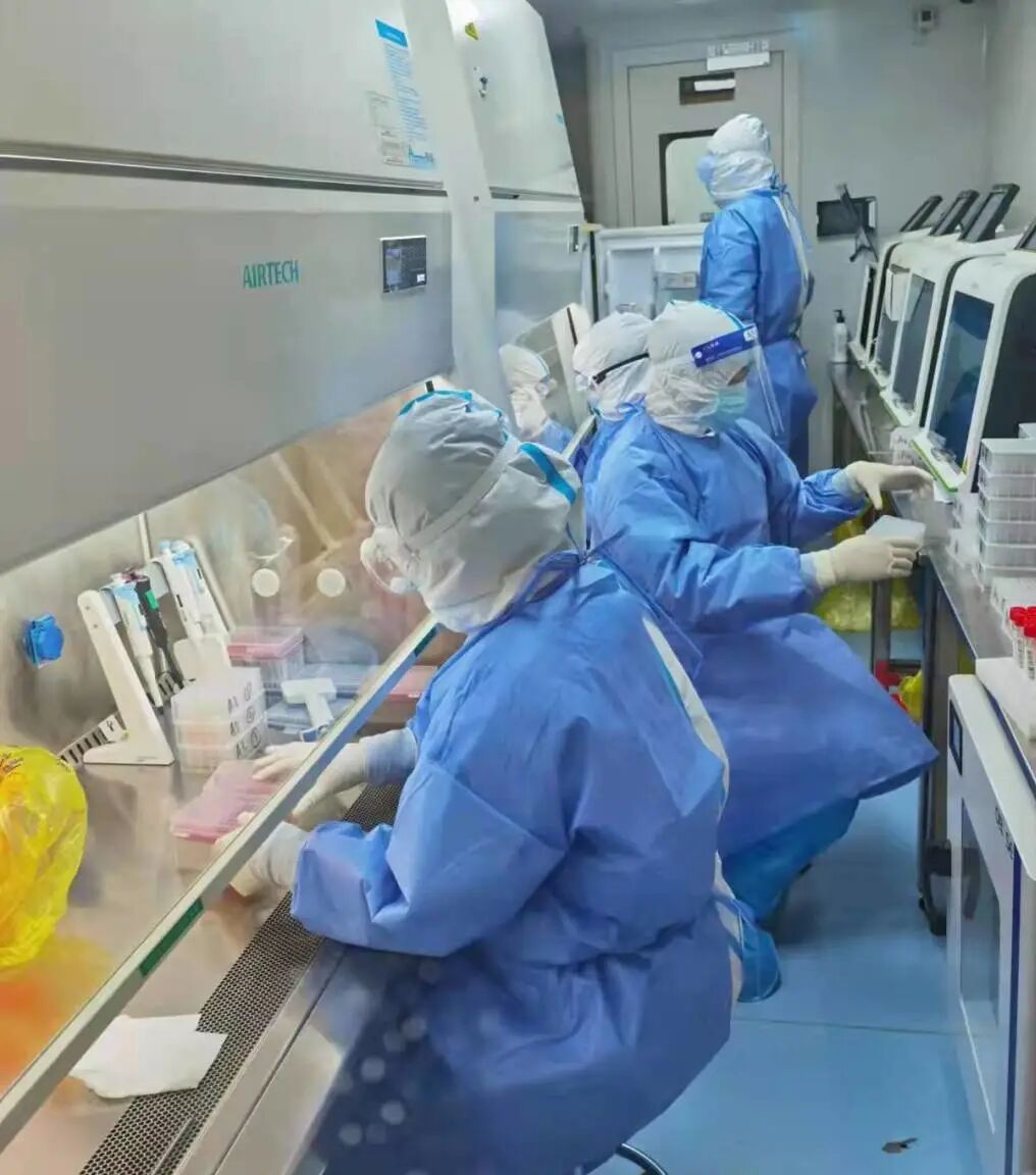 ▲王詔書與隊員們在方艙實驗室內(nèi)進行核酸檢測工作