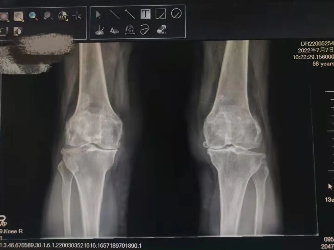 今年66歲的劉阿姨,患有多年嚴重的膝骨關(guān)節(jié)炎,并伴隨嚴重的膝關(guān)節(jié)外翻。起初,她以為適當休息就可緩解疼痛;然而,隨著年齡的增長,劉阿姨雙膝關(guān)節(jié)疼痛的愈發(fā)加劇,甚至嚴重影響日常生活。為此,劉阿姨在家人的陪同下來到了株洲市二醫(yī)院康復(fù)醫(yī)學(xué)科進行保守治療,后根據(jù)本院骨科專家評估與診斷,建議對劉阿姨進行雙膝關(guān)節(jié)置換術(shù),從而進一步改善多年疼痛問題。