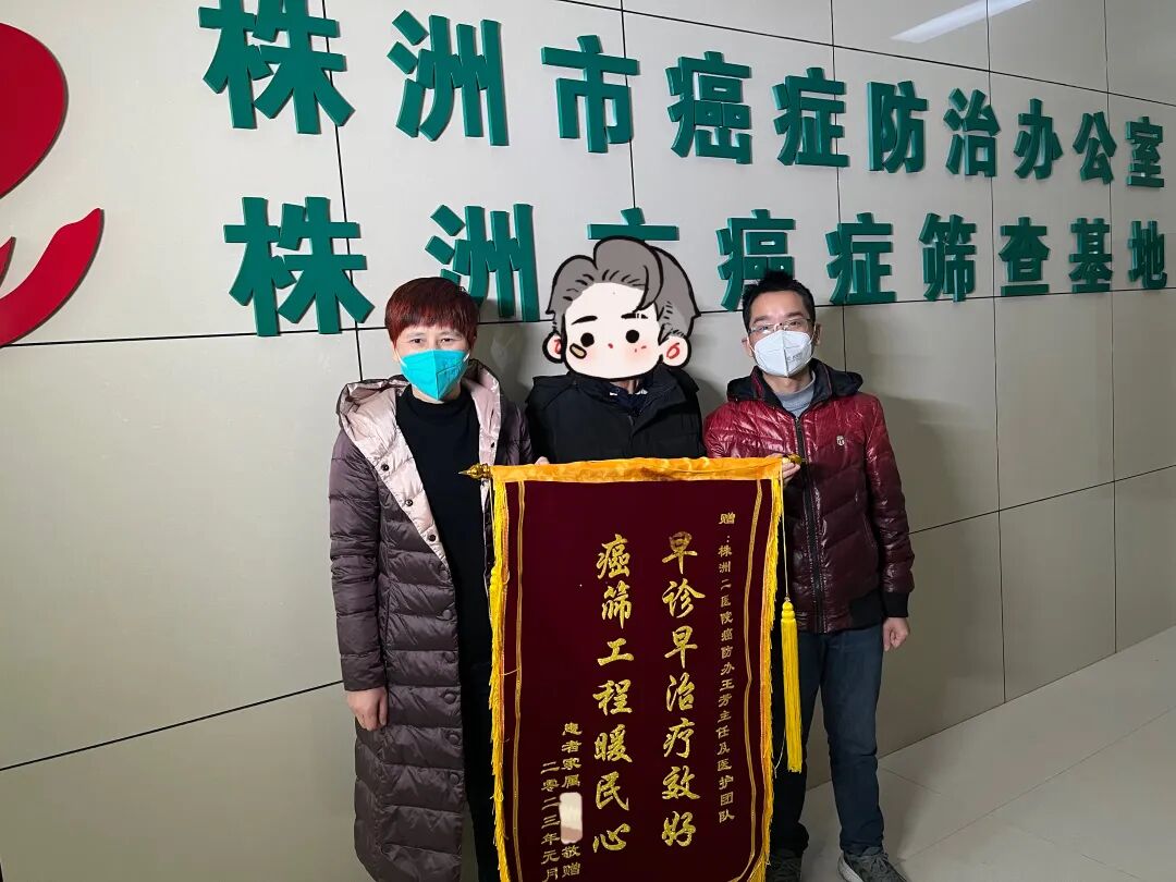 今年1月,71歲的李爺爺將一面印有“早診早治療效好,癌篩工程暖民心”的錦旗送至株洲市二醫(yī)院腫瘤一科及癌防辦,“要不是通過癌篩,我都不知道自己已經(jīng)患病,謝謝你們挽救了我的生命!”李爺爺說。
