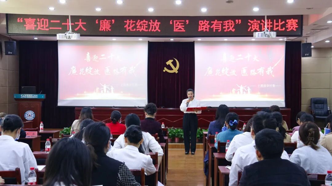 比賽現(xiàn)場(chǎng),來(lái)自全院各黨支部的33名參賽選手緊扣迎接黨的二十大召開(kāi)這條主線,聚焦 “‘廉’花綻放 ‘醫(yī)’路有我”的比賽主題,從自身本職工作出發(fā)講述了作為新時(shí)代醫(yī)護(hù)工作者的所思所感。他們中有工作多年的高年資醫(yī)生、剛?cè)肼毑痪玫摹?0后”護(hù)士、為守護(hù)人民群眾健康奔波在“抗疫”一線的骨干、在職能部門(mén)默默奉獻(xiàn)做好后勤保障服務(wù)的行政人員。他們用飽滿的熱情、生動(dòng)的語(yǔ)言、真摯的感情,講述了一個(gè)個(gè)履職敬業(yè)、護(hù)佑生命的典型事例,充分展示了二醫(yī)人在時(shí)代的進(jìn)程中開(kāi)拓創(chuàng)新、奮力“闖創(chuàng)干”的精神風(fēng)貌和責(zé)任擔(dān)當(dāng),鏗鏘有力的道出了二醫(yī)人對(duì)黨和國(guó)家的熱愛(ài)與忠誠(chéng),抒發(fā)了對(duì)工作的熱愛(ài)之情和對(duì)祖國(guó)的美好祝愿。精彩的演講感染了在場(chǎng)的評(píng)委和觀眾,現(xiàn)場(chǎng)掌聲雷動(dòng),氣氛十分熱烈。