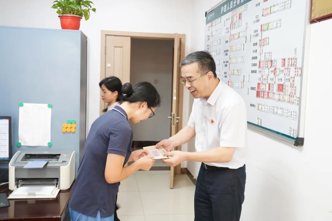 “七一”前夕,院黨委書記鄒祖倡同志帶領(lǐng)黨務(wù)工作科及支部書記開展走訪慰問活動(dòng)。他深入一線科室慰問了困難黨員,并走訪慰問了老黨員,向他們致以節(jié)日的問候,送去黨組織的溫暖和關(guān)懷。他親切詢問老黨員的身體和生活情況,衷心感謝他們?cè)谶^去的歲月里為醫(yī)院發(fā)展作出的重要貢獻(xiàn),同時(shí)叮囑老黨員要注意保重身體,祝福他們幸福安康;希望老黨員能夠退休不褪色,離崗不離黨,一如既往地關(guān)心醫(yī)院的發(fā)展,多提寶貴意見和建議,共推醫(yī)院高質(zhì)量發(fā)展。