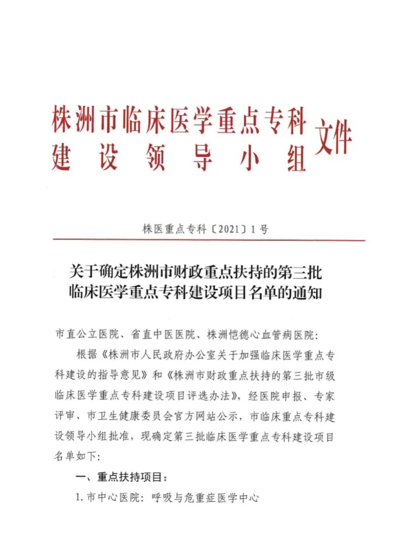 5月6日,株洲市臨床醫(yī)學(xué)重點專科建設(shè)領(lǐng)導(dǎo)小組辦公室公布了株洲市財政重點扶持的第三批臨床醫(yī)學(xué)重點??平ㄔO(shè)項目評審結(jié)果,株洲市二醫(yī)院腫瘤內(nèi)科、腫瘤外科兩個??偏@株洲市財政重點獎勵項目。