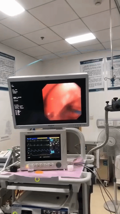 此時(shí)的王奶奶經(jīng)過長達(dá)三個(gè)月的病痛折磨,身體各方面機(jī)能已進(jìn)入透支狀態(tài)。通過完善影像學(xué)等多項(xiàng)檢查后,劉和平主任發(fā)現(xiàn)老人右胸氣管內(nèi)的巨大骨性異物深深嵌頓入氣管內(nèi)粘膜,異物周圍粘膜高度充血腫脹且肉芽組織增生嚴(yán)重,整個(gè)氣管幾乎全部堵住,僅留一絲縫隙。